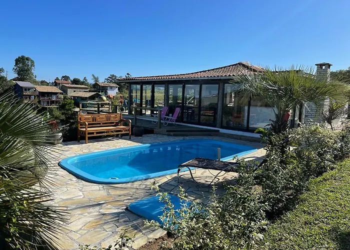 Situated a 25-minute walk from the Praia do Luz, Casa Com Banheira, Piscina E Quadra De Areia Villa Praia do Rosa invites guests to relax at a terrace. The 1-bedroom villa offers a private pool as well as a hot tub to unwind after a busy day.